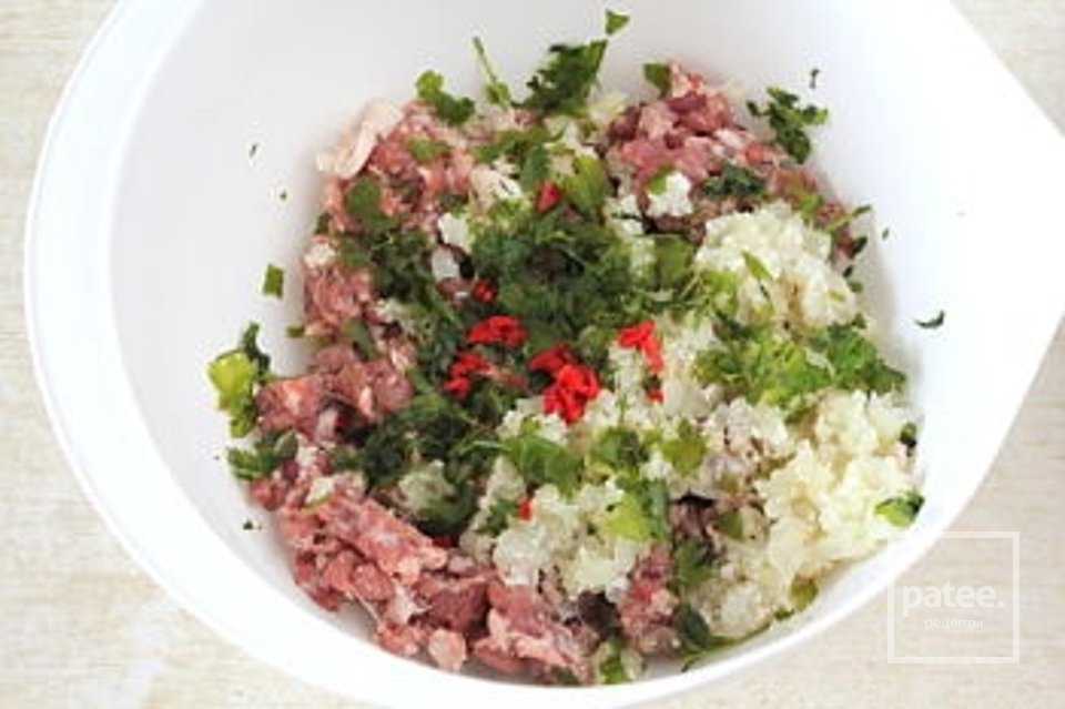 Сварившуюся фасоль в горячем виде прокручиваем на мясорубке. Добавляем жареный лук, мелко нарезанные 1 или 2 зубчика чеснока, примерно чайную ложку сухого чабреца. Соль и перец — по вкусу. Хорошо перемешиваем и скатываем в шар. Если начинка кажется суховатой, можно добавить чуть-чуть молока.