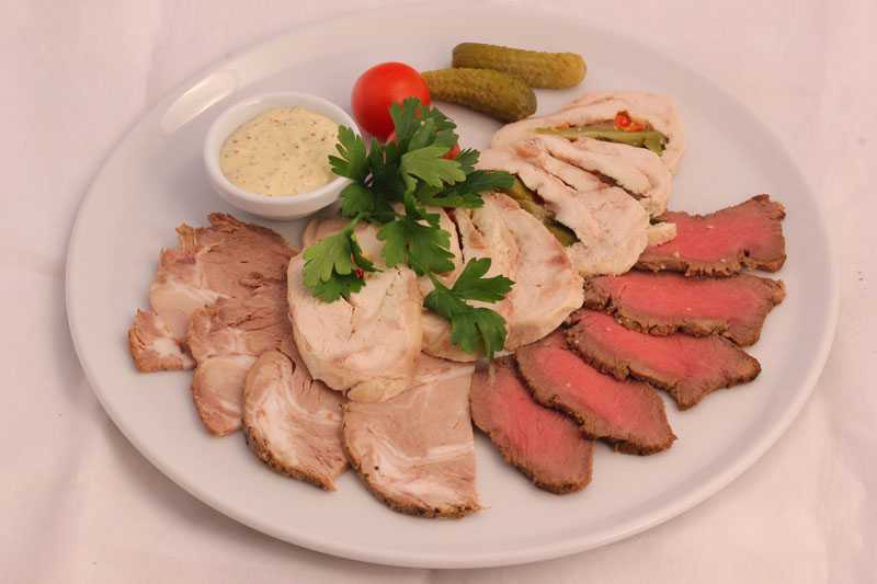 Такие рулеты готовятся из трех видов мяса — говядины, свинины и курятины. Ассорти из рулетов нужно подавать на красивой тарелке. Можно украсить блюдо свежими овощами и веточками зелени.