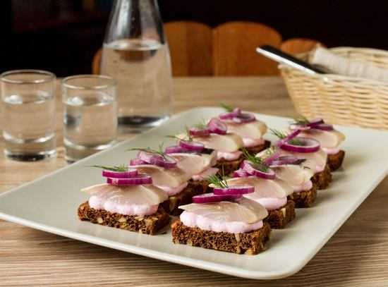 - Остывшие корзиночки из бородинского хлеба выньте из формочек и разложите на красивом блюде или подносе. Аккуратно выложите в каждую тартар из сельди. В центре тартара в каждой корзиночке сделайте углубление.