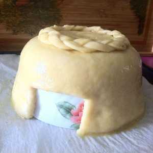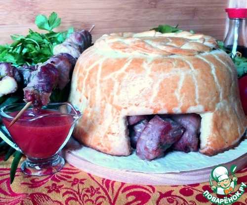 Раскатываем тесто толщиной не больше 0.5 мм. Можно и тоньше. Переносим его на перевернутую жаропрочную форму, смазанную маслом. Сбоку вырезаем отверстие, чтобы потом можно было видеть готовый шашлык. Смазываем яйцом и выпекаем при 180 градусах до золотистой корочки. В зависимости от духовки и толщины теста это займет 40-60 минут.