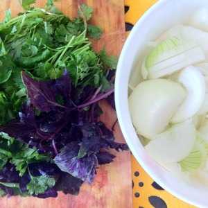 Лук очистить и нарезать полукольцами. Зелень крупно нарубить.
