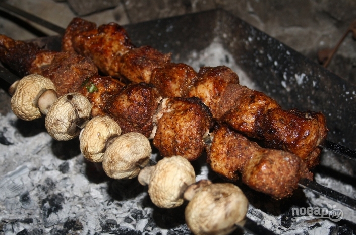 3. Теперь обжарим на мангале. В качестве гарнира я готовила грибочки. Для этого просто насаживала шампиньоны на шампура и жарила параллельно с шашлыком.