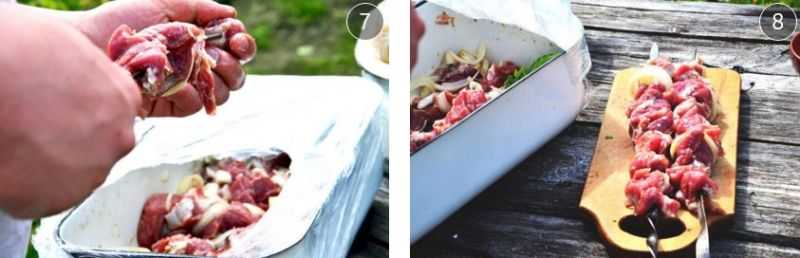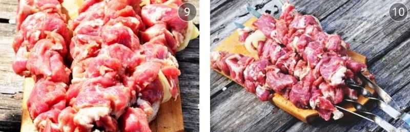 5. Нанижите мясо на шампуры, чередуя с замаринованным луком.