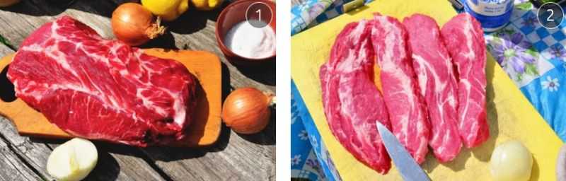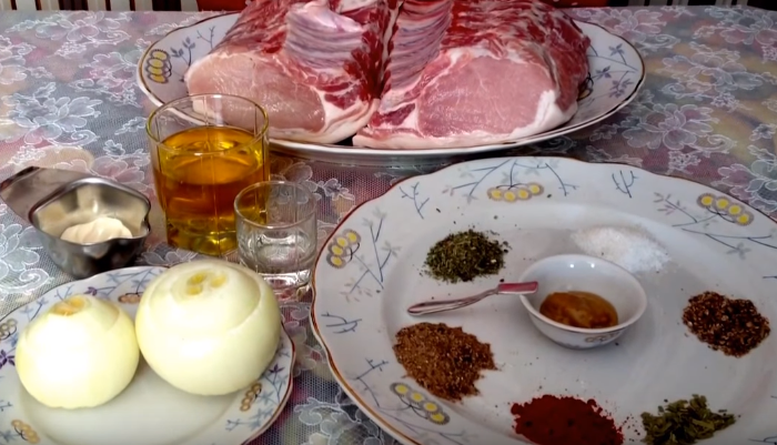 Для приготовления этой вкуснотищи нам понадобится минимум ингредиентов. Единственным условием является качество мяса. Оно должно быть обязательно от той части шеи, где есть жировые прожилки — иначе будет не так вкусно: