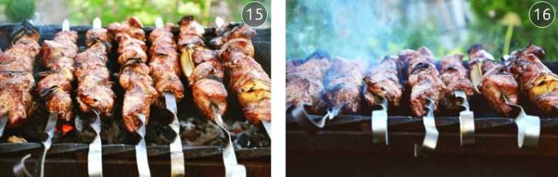 6. Жарьте на мангале. Остатки маринада можно развести водой и сбрызгивать мясо во время жарки, предотвращая его подгорание.