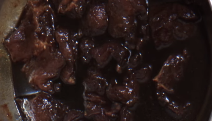 - Кастрюлю с мясом укрыть пленкой и спрятать в холодильник хотя бы на час (лучше на 2-3 часа).