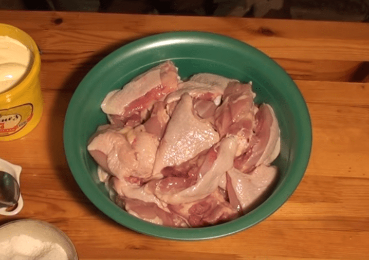 - Затем каждый кусок курицы обмазывается получившейся смесью, выкладывается в подготовленную миску и оставляется для маринования на полтора часа.