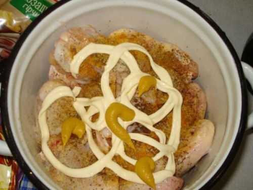 - В отдельной посудине соединяются майонез и жидкая горчица, а затем эта смесь добавляется к мясу. Все нужно основательно перемешать, а затем отправить мариноваться.