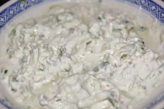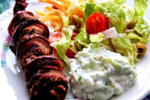 Пока готовится шашлык, принимайтесь за приготовление дополнения к нему.Сперва соус. Для него вам нужно смешать гомогенизированный натуральный творог с тертым свежим огурцом. Сперва натрите огурец, смешайте его с солью, перцем и орегано, а уже затем добавляйте творог. Готовый соус отправьте в холодильник на 20 минут.