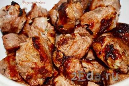 Ждем полчаса, но больше не стоит, в обратном случае получится пюре. Нанизываем кусочки на шампуры. Укладываем их на угли с жаром плотно друг к другу. Главное, чтобы угли не горели, а отдавали жар. Не стоит далеко отходить от мангала, не забывайте переворачивать шашлычок, а то получится уголь. Это идеальный вариант для спонтанного пикника, блюдо получается мягким, с небольшой кислинкой.