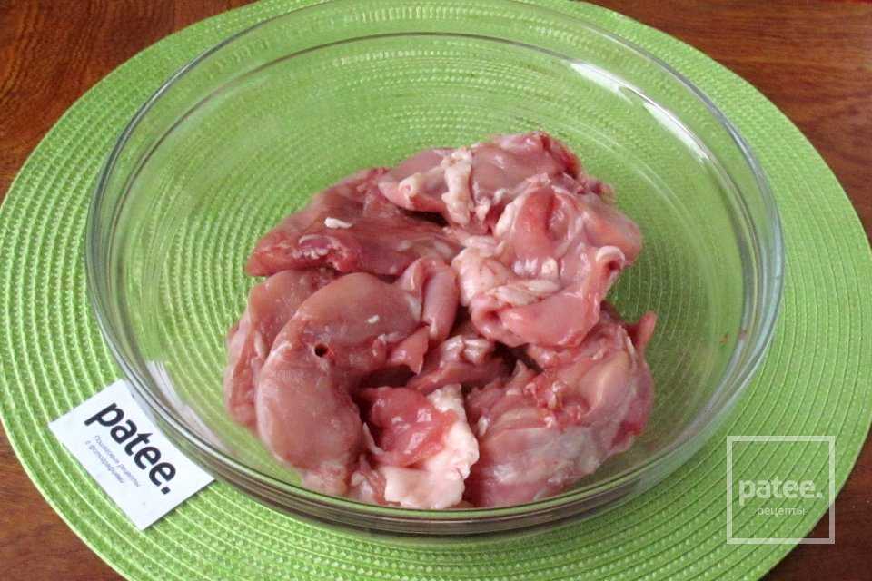 - Мясо птицы или свинину нарежьте кусками по 3-4 см.