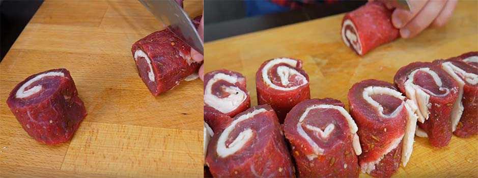 Теперь нарезаем рулетики поперек на небольшие кусочки в виде мидальонов.