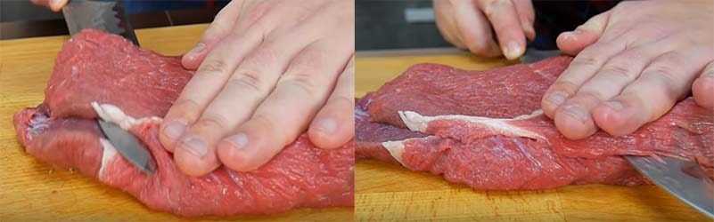 Для этого хорошо прижимаем рукой и ведем нож вдоль куска. Получаются красивые длинные мясные пластины.