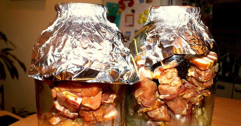 -10- Венчик банки накройте алюминиевой фольгой для выпечки. Блестящая отражающая сторона должна быть наружу. Хорошо зафиксируйте фольгу, чтобы горячий воздух при запекании в духовке не выходил из банки. Поставьте шашлык в холодный духовой шкаф. Это необходимо в целях безопасности, чтобы стекло не лопнуло от резкого перепада температуры. Включите нагрев до 180-200 градусов. И готовьте блюдо около часа. Когда мясо приготовится, оно приобретет румяную корочку, а при разрезании будет выделяться прозрачный сок без примеси крови. |