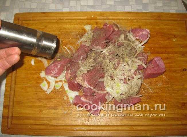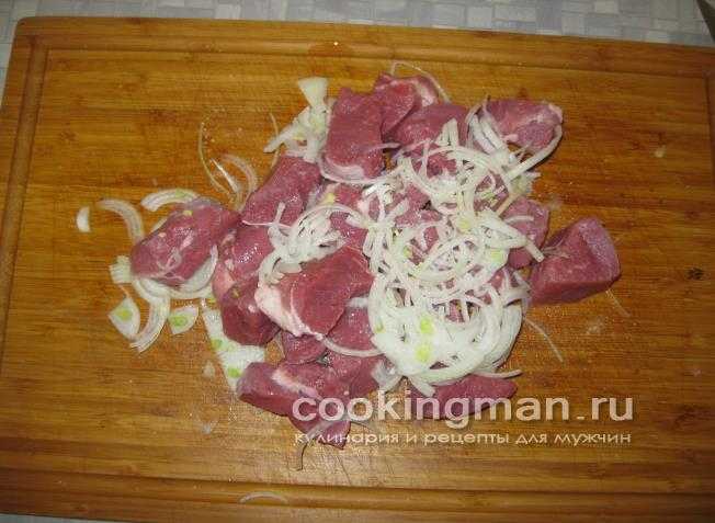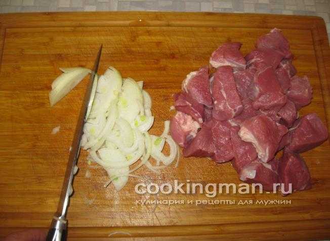 Свинину нужно промыть, обсушить бумажной салфеткой, удалить пленочки и нарезать порционными кусками. Луковицы следует очистить и нарезать колечками, пересыпать вместе с мясом в глубокую миску.