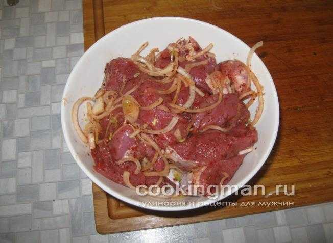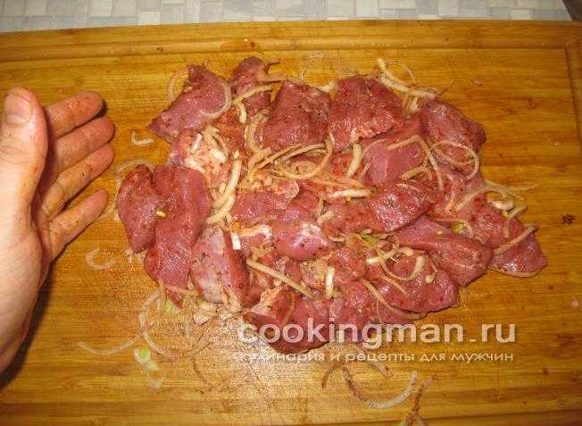 Репчатый лук нужно нарезать кольцами, слегка помять руками, чтобы выделился сок, добавить майонез, соль и пряности по своему вкусу. В этом маринаде мясо должно мариноваться не менее 6-8 часов.