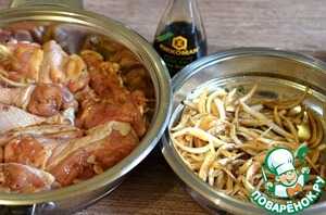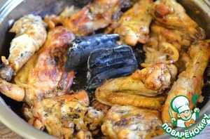 Когда мясо почти готово, влейте маринад с луком, в котором мясо стояло (предварительно можно слить лишний жир с курицы, если его очень много). Добавьте нарезанный на дольки лимон.