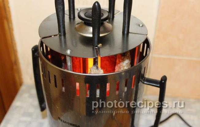 Закрываем кожухом и ждём результата. Электрический прибор легко справляется со своей задачей. Шампура медленно крутятся вокруг своей оси, мясо скворчит чуть слышно, знакомый запах постепенно заполняет пространство.