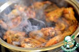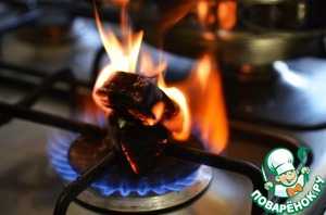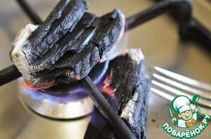 Выключить газ. Готовое мясо отодвиньте с середины, освободив место для угля. Уголь (красный от накала) надо положить в центр в жир. Сразу же закрыть сковородку герметично крышкой.
