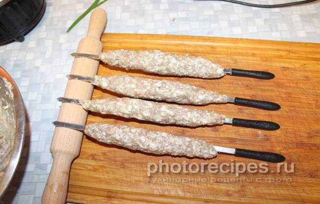 Тщательно вымешенный бараний фарш нанижем (чуть смоченными теплой водой) руками на шпажки. Делается это не сложно. Формируем из фарша шар, берем его в левую руку, нанизываем шар на шпажку, и чуть прокручивая шпажку правой рукой в одном направлении, как бы протягиваем фарш по всей длине шампура… тьфу, ты! там на самом деле проще сделать чем этот процесс описать!
