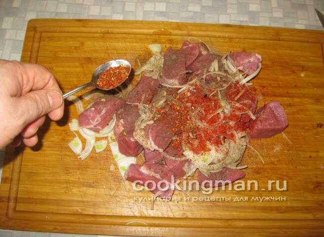 Как и в обычном приготовлении шашлыка, мясо нужно замариновать. Только в данном случае кусочки нарезаем мельче, чтобы они не соприкасались с нагревателем. Добавляем к мясу соль, перец, приправы.