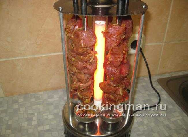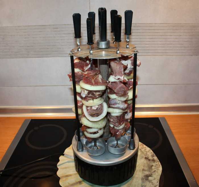 Когда придет время, то просто насаживаем по очереди на шампур мясо и кольцо лука. Устанавливаем наполненный шампур с мясом в шашлычницу. Закрываем ее и включаем.