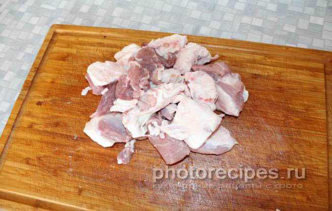 Берем баранину попостнее (мне пришлось срезать почти весь жир с этих кусков) и нарезаем ее небольшими кусками, чтоб их потом можно было перекрутить на мясорубке,