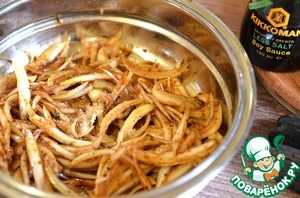 Лук нарезать полукольцами. Моё наблюдение — в арабских странах (Ливия, Тунис) я не видела, чтобы лук нарезали поперёк, только вдоль луковицы. Когда я нарезала «по-нашему», мне сказали, что так будет невкусно и, действительно, вдоль вкуснее. Для сравнения: профи-кулинары знают, что натёртый на тёрке лук слегка горчит и может иногда испортить блюдо.