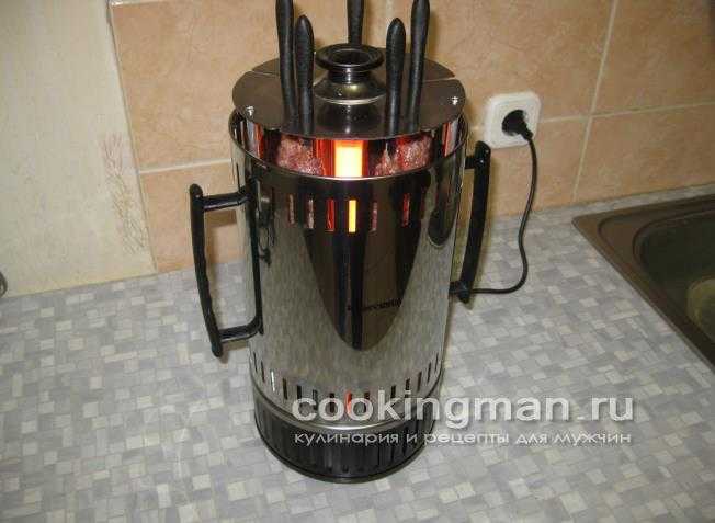 Далее устройство нужно накрыть крышкой и включить режим приготовления, подсоединив агрегат к электрической сети. Сколько готовится свинина в электрошашлычнице – обычно не более 14-16 минут.