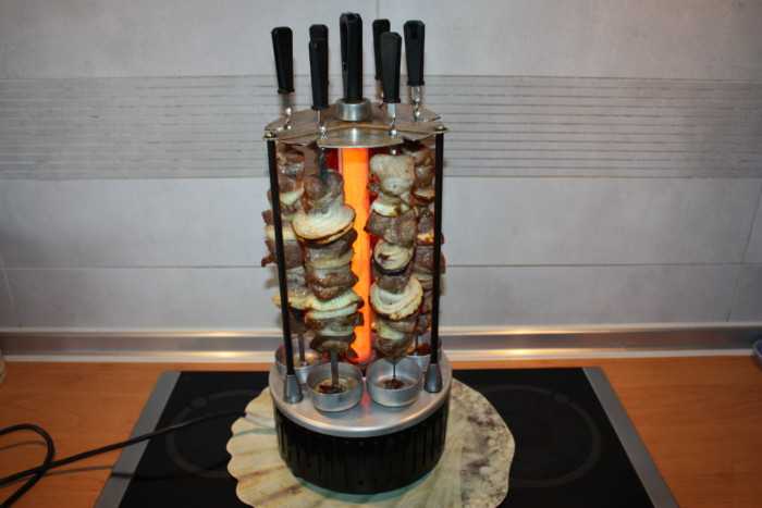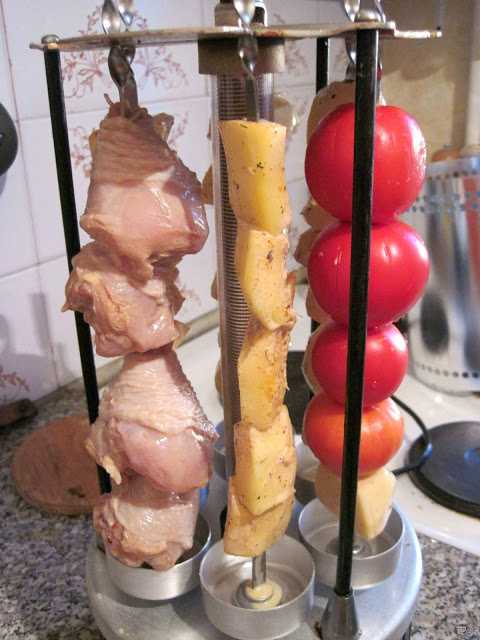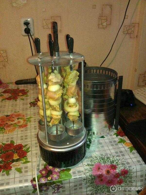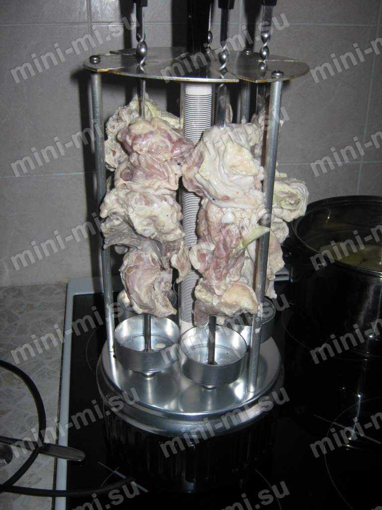 Чашечки ставятся на болтики, торчащие внизу прибора. Шампура с мясом вставляются в общую конструкцию остриём в чашу, а ручкой в верхнюю прорезь. Кожух надевается сверху на всё изделие.