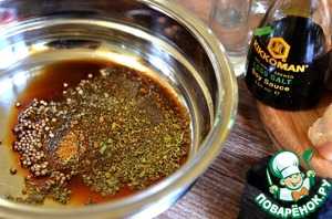В миску для маринования мяса добавляем соевый соус и все специи. (к слову, я уже говорила, что в Крыму такого нет и мне пришлось помучиться, чтобы достать его, но он того стоит, вкус отменный.)