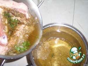 На 10 кг нужно 700 г минеральной воды и 4-5 лимонов. Но в том случае жидкость не покрывает все мясо. Поступаем таким образом. Несколько раз сливаем.