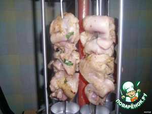 После чего, нагреем электрошашлычницу, и установим шпажки в разъемы.