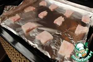 Низ противня выстилаем фольгой и произвольно укладываем на нее несколько кусочков сала. С наших шашлыков будет капать сало и сок. Сало на фольге не даст ему преждевременно задымиться.