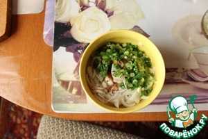 Нарезаем лук тонкими полукольцами, промываем его несколько раз в холодной воде, добавляем нарезанную зелень, перец, соль, немного лимонного сока.