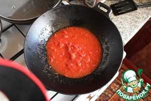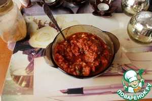 Ставим наши помидорки в сковороде на умеренную комфорку и тушим 8-10 минут. Выравниваем на соль, сахар, перец, вмешиваем зелень и пюрированный чеснок. Тушим еще 5-7 минут. Соус я делала на свином сале. Получилось очень вкусно. Вместо перца можете капнуть Табаско (3-4 капли) или добавить аджики. Соус к шашлыкам прочно осел в семейной копилочке. Летом буду делать из свежей помидоры.
