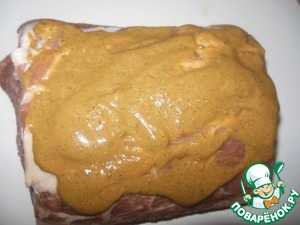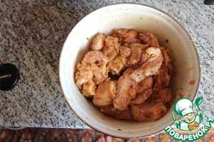 Мясо я немного посолила, и хорошенько обмазала соусом. Оставила мариноваться. Стояло 2 часа.