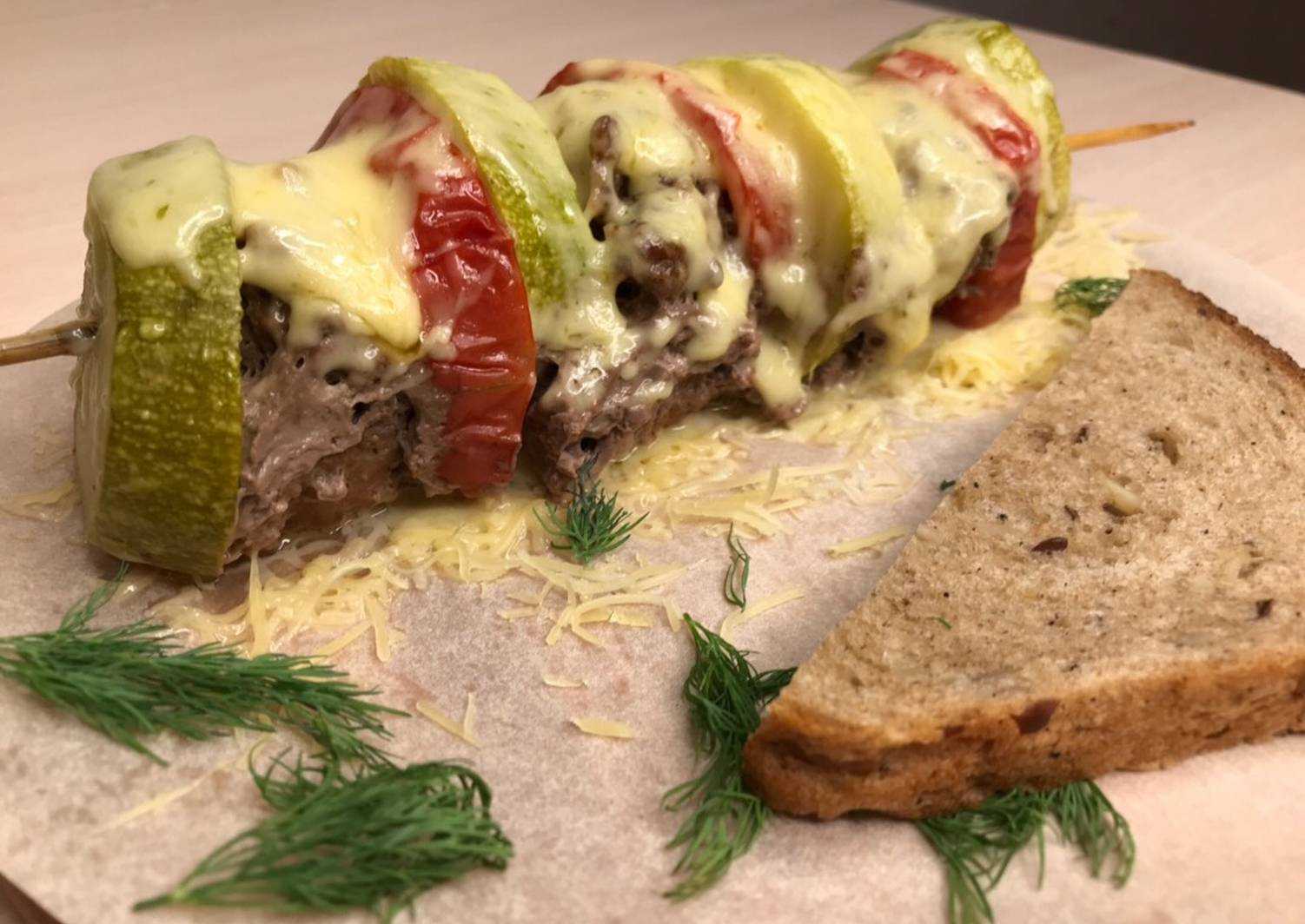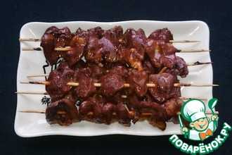 Противень застелить бумагой для выпечки, выложить шашлычки. Готовить примерно 10 минут при температуре 180 градусов, в середине приготовления можно аккуратно перевернуть.