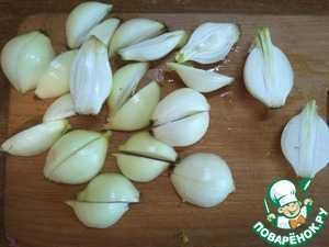 Нарежем более крупные луковички на «четвертинки», более мелкие на «половинки».
