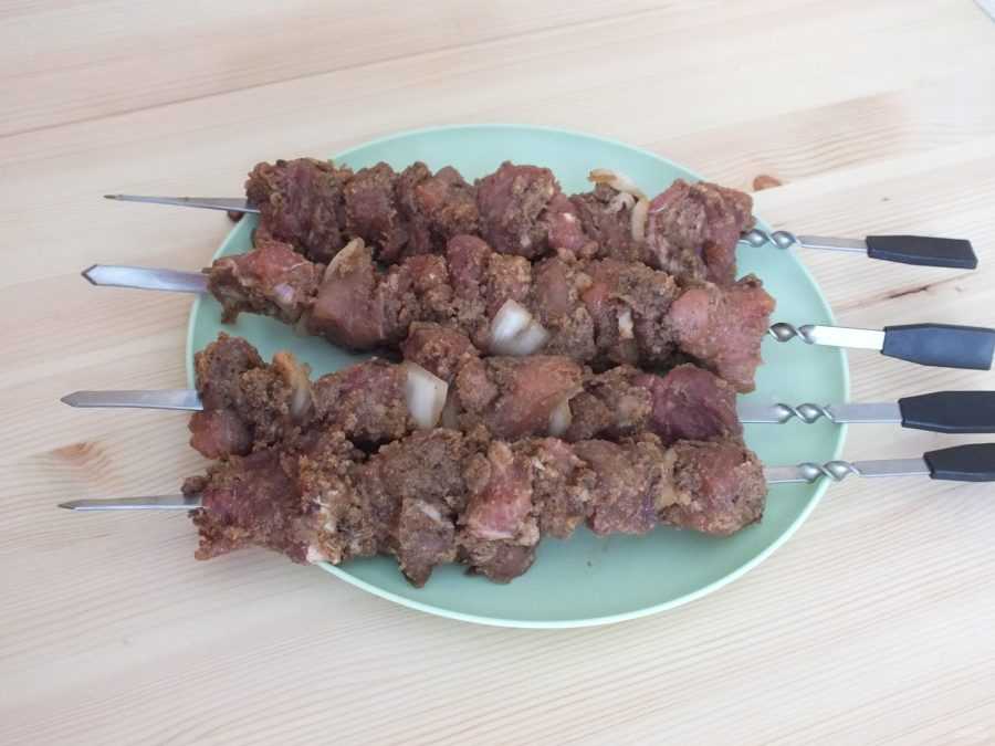 Теперь шпажки продеть вертикально через весь кусок на 5-6 см. друг от друга. Смазать маслом кусок и посыпать специями. Разрезать мясо по середине между шпажками. Оставьте мариноваться, а сами спокойно собирайтесь на пикник.
