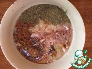 Добавим к луку вино (пиво), травы, соевый соус, растительное масло и смесь перцев. СОЛЬ НЕ ДОБАВЛЯЕМ!