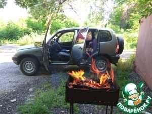 Щепу из набора замочить на 30 мин. В мангале (мы берем с собой «спутник», как мы его ласково называем) от «Forester» подготовить угли и начинаем жарить наши гармошки. Поворачивая их всеми сторонами.
