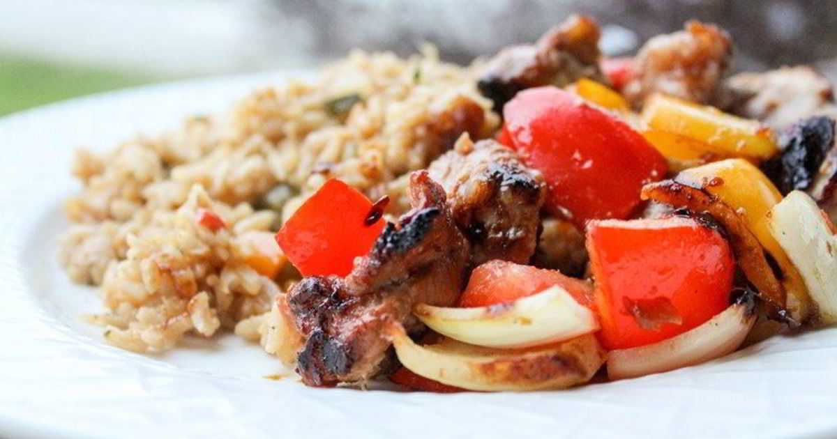 11. При насаживании на шампуры кусочки мяса чередовать с луком и красным перцем. Во время жарки шашлыки периодически взбрызгивать оставшимся маринадом.