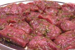- Обработанное мясо нарезается на порционные кубики, которые слегка отбиваются и помещаются в емкость для маринования.