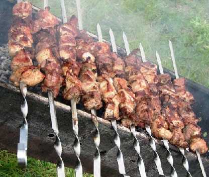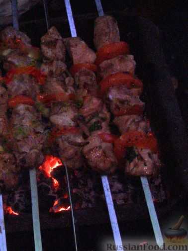 - Готовить шашлык необходимо на горячих углях, избегая открытого огня. Время от времени следует переворачивать шампур и при необходимости сбрызгивать маринадом.
