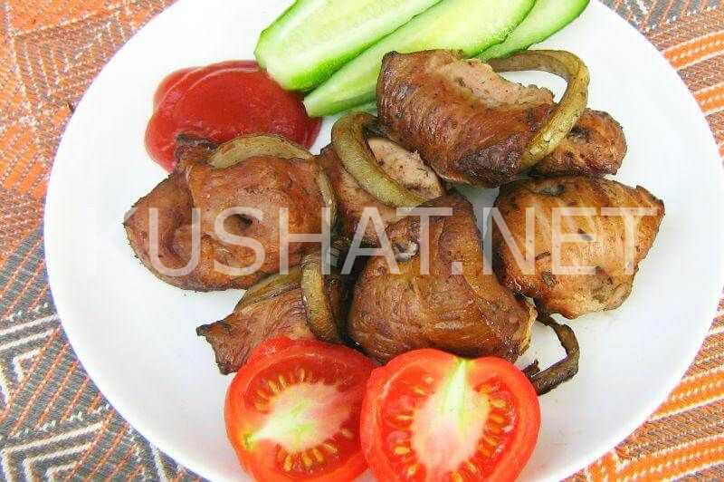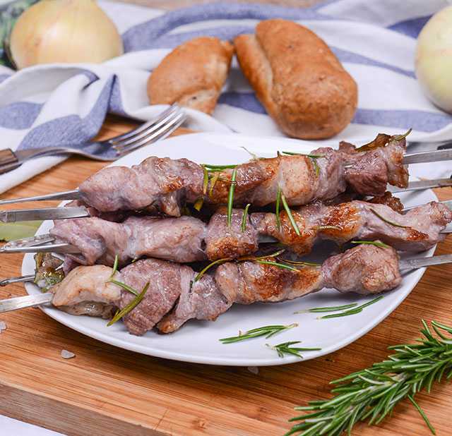 - При нанизывании на шампур кусочки мяса можно чередовать с луком, помидорами или перцем.