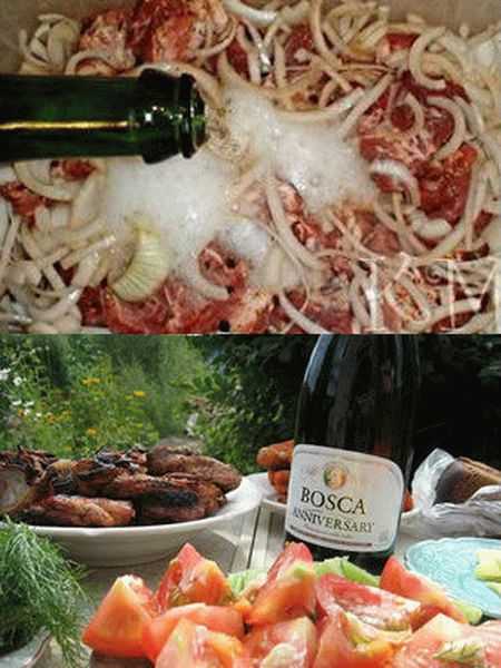 Если вы любите шашлыки, то наверняка знаете: результат зависит от качества выбранного мяса и рецепта использованного маринада. Одним из наиболее изысканных, благородных и одновременно эффективных считается маринад ля шашлыка с вином. Рецепты его подойдут для любого вида мяса, нужно лишь правильно подобрать сорт напитка. В красном вине маринуют баранину, говядину и свинину. Маринад на белом вине универсален. Он подходит не только для красного мяса, но и для птицы, рыбы. То же самое можно сказать о шампанском, которое совмещает в себе силу вина и минералки, позволяя замариновать мясо для гриля намного быстрее. Приведем 3 рецепта маринада для шашлыка на разных видах алкогольных напитков, дадим советы, как мариновать мясо для жарки на углях правильно.