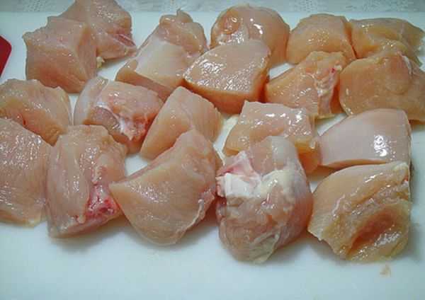 Курицу для шашлыка нарезают небольшими кусочками