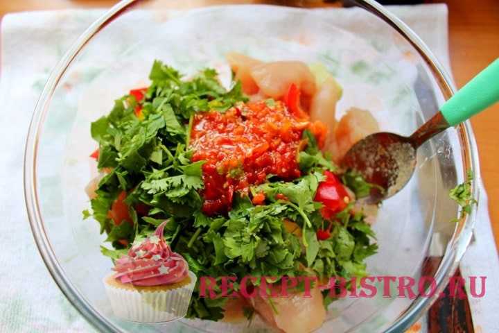 - Посолить будущий шашлык и добавить к нему приправы. Можно подобрать что-то на свой вкус, но обычно кладут перец (черный, красный, белый), хмели-сунели, паприку или карри. Оставить на 20-25 минут, тщательно перемешав руками.