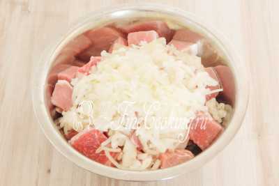 Перекладываем мятый лук вместе с соком к кусочкам свинины.